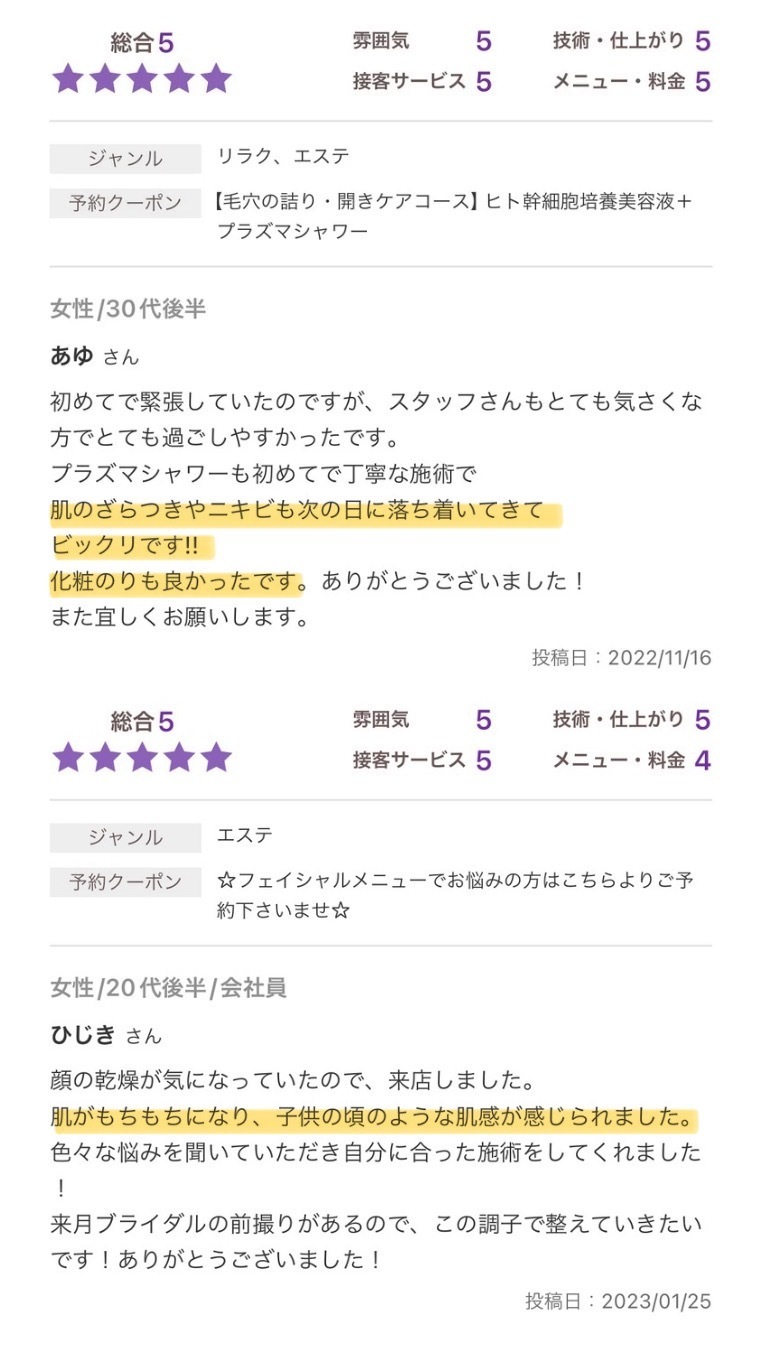 そこで、プラズマと美容とヒト幹細胞培養液を使った美容技術に出会い明らかに今まで感じたことのない効果を感じることができ、この技術なら自信をもって提供できると確信をしより多くの方に提供することを決意しました。